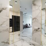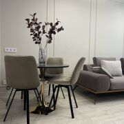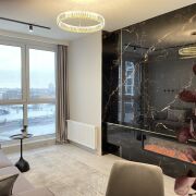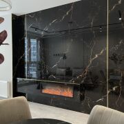В гостиной установлен современный камин, удобный дизайнерский диван, обеденный стол со столешницей из керамогранита и стулья с вращеющим механизмом.