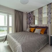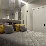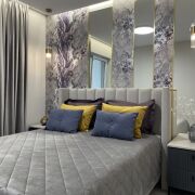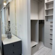 В спальне имеется вместительная гардеробная с множеством шуфлядок. Кровать оснащена подъёмным механизмом. Качественный ортопедический матрас.