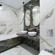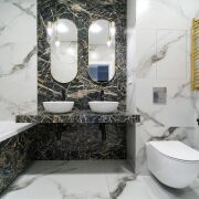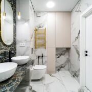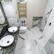 В санузле установлена акриловая ванна Бренд Kolpa-San 170 Х 75 с тропическим душем. Безободковый подвесной унитаз с гигиеническим душем, просторная столешница с 2-мя умывальниками, проточный водонагреватель Thermex, вентилятор скрытого монтажа с обратным клапаном.