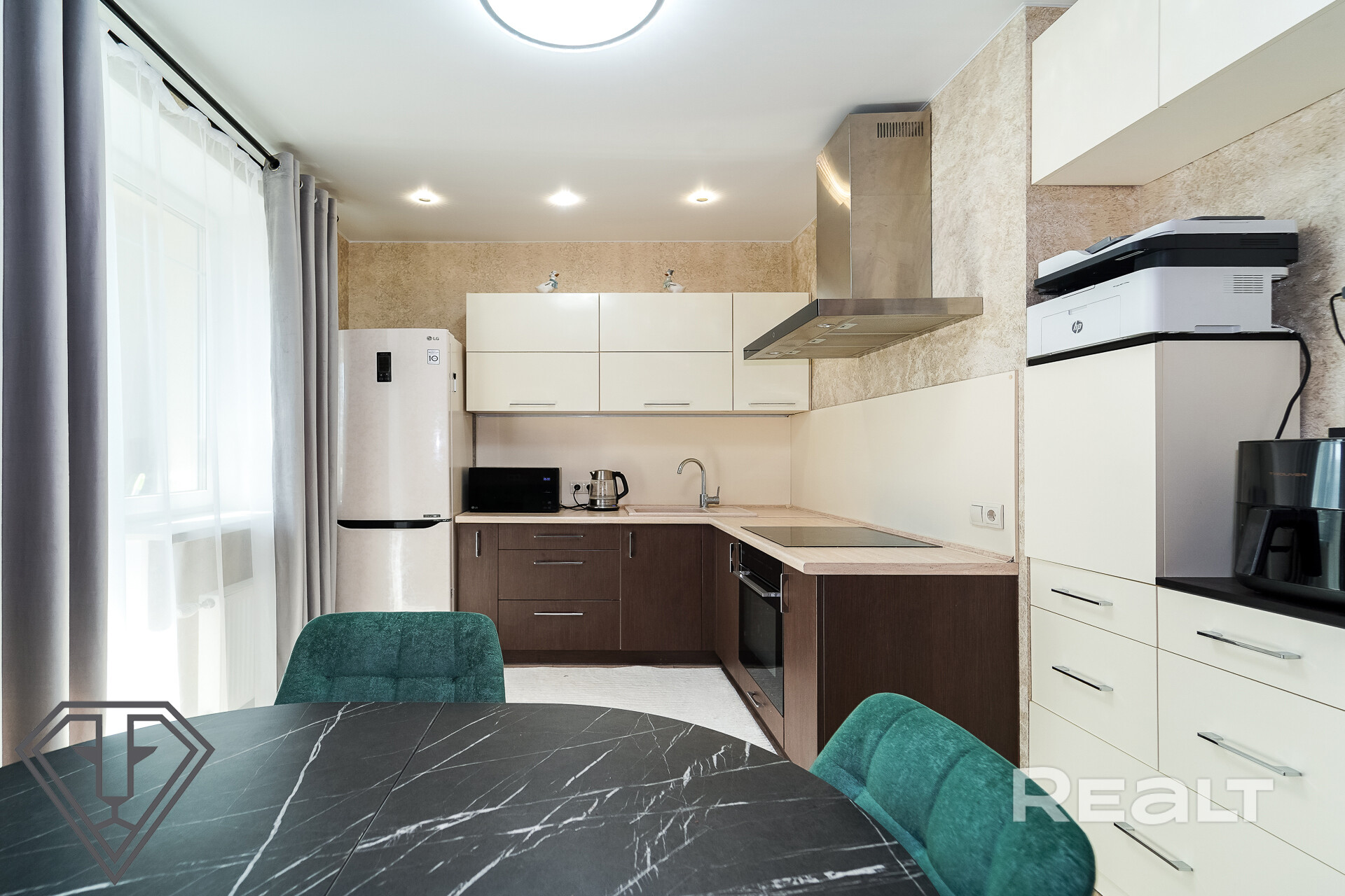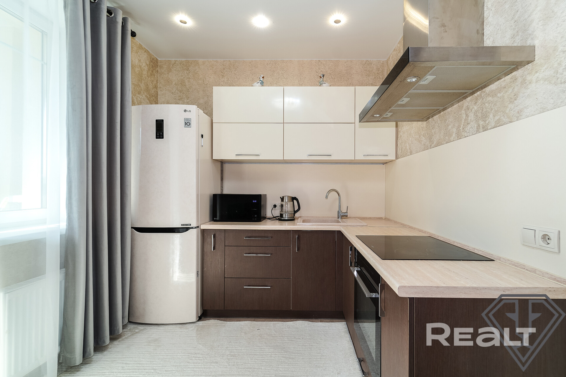 Встроенная кухня с техникой: индукционная варочная панель, вытяжка, духовой шкаф, холодильник.