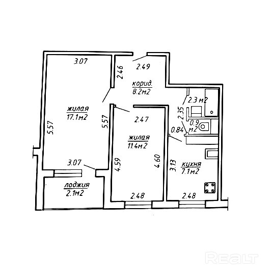 Кухня 7,1 кв.м.(установлена электрическая плита); жилая комната 17,1 кв.м,  с выходом на застекленную лоджию; жилая комната 11.4 кв.м., раздельные -  санузел и ванная комната.