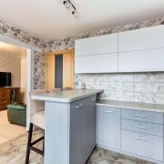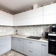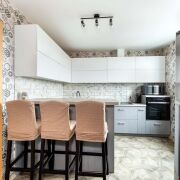 -Современная угловая кухня в светло-серых тонах с белым верхом — мечта любой хозяйки! Стильный фартук из плитки с мраморным рисунком, встроенная техника премиум-класса: варочная панель Bosch, духовой шкаф Whirlpool, СВЧ, холодильник side-by-side. Вместительные шкафы и удобная барная стойка. Кухня не только функциональная, но и невероятно красивая!