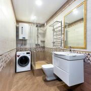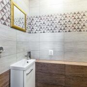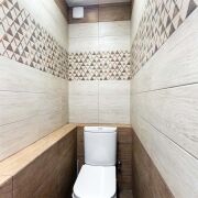 -Два санузла отделаны современной плиткой европейских производителей под дерево с геометрическими акцентами. Установлена качественная сантехника ROCA, в одном из санузлов — стильная душевая кабина из закалённого стекла. Зеркало в стильной раме, продуманные места для хранения. Дизайн выполнен со вкусом — сочетание натуральных оттенков и современных решений.