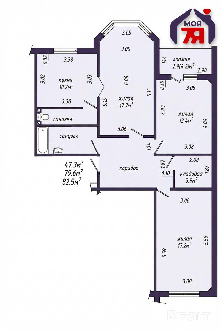 -Квартира расположена на комфортном 4  этаже 10-этажного дома. Общая площадь по СНБ — 82,5 м2, жилая — 47,4 м2.
