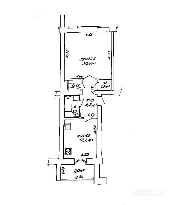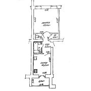 Площадь по СНБ 45,4 кв.м., общая 43.4 кв.м., жилая 20,4 кв.м., кухня 12,2 кв.м. Санузел раздельныЙ. Окна комнаты и кухни выходят на две стороны дома.. Редкая и отличная планировка квартиры с большим потенциалом к реконструкции и перепланировки в двухкомнатную квартиру.. Большая гардеробная комната в размере 1,3 м кв..