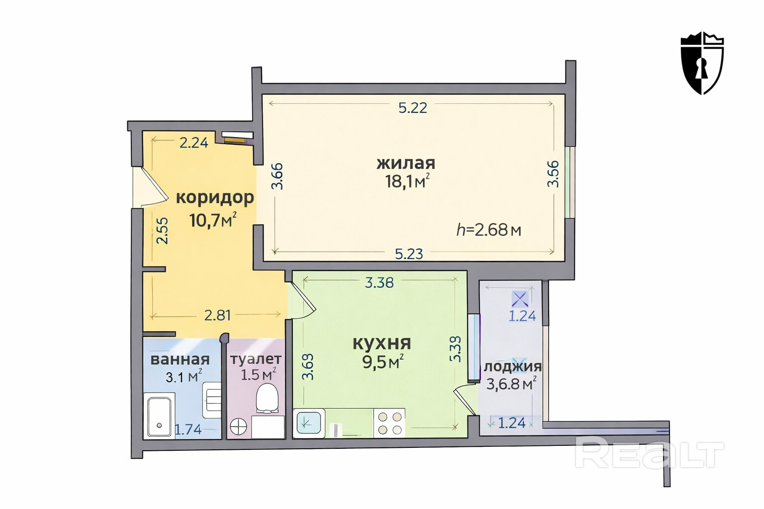 Продается однокомнатная квартира в современном микрорайоне Минска. Не угловая, расположена на удобном 9 этаже. Современный дом 2014 года постройки, что означает современные стандарты и качество. Одна из лучших планировок застройщика 45,3 м2 по СНБ -Общая площадь 42,6 м2 -Просторная светлая комната 18,1 м2 -Большая кухня 9,5 м2 с выходом на застекленную лоджию -Просторная лоджия с остеклением 3,4 м2 -раздельный санузел -регулируемые современные радиаторы