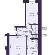 -Общая площадь — 61,5 м2. Продуманная планировка: две просторные комнаты (19 м2 и 14,3 м2), большая кухня 11,2 м2, большая ванная и раздельный санузел.