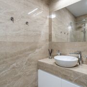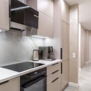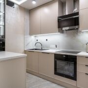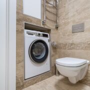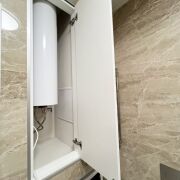 Кухня сделана по индивидуальному дизайнерскому проекту и оборудована всей необходимой встроенной бытовой техникой «Electrolux»: холодильником, микроволновой печью, духовым шкафом, варочной панелью, вытяжкой, посудомоечной машиной (60 см).  Современная ванная комната с душевой кабиной, отделенной стеклянными перегородками. Вся сантехника - качественных европейских брендов (Villeroy & Boch), смеситель и тропический душ с термостатом Hansgrohe, инвентарь ванной комнаты Grohe, инсталляция TECE. Как приятный бонус, установлен накопительный бойлер Electrolux на 50 литров и стиральная машина «Bosch». На полах - импортная керамическая плитка и ламинат самого высокого класса. В коридоре и в санузле - современная энергоэффективная система «тёплый пол» датской компании Devi с умным терморегулятором, создающая дополнительный комфорт в любое время года, не изменяя при этом микроклимат помещений. Вас обязательно порадует благоустроенная лоджия - дополнительное место для отдыха и работы.