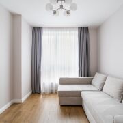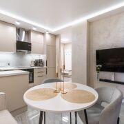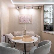 Ремонт в светлых пастельных тонах придаёт квартире постоянное ощущение свежести и пространства. Мебель из дерева сделана на заказ - такого вы не найдете в типовых вариантах.