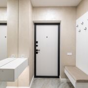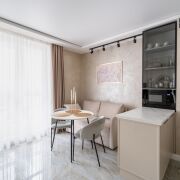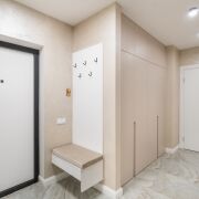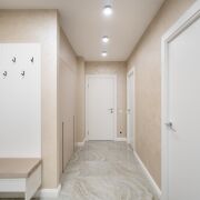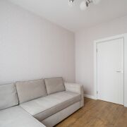 Установлена массивная металлическая входная дверь. Все двери - с магнитными защелками. В квартире - распределительный электрощиток. Стены украшает декоративная штукатурка. Потолки из гипсокартона и дополнены современными трековыми системами и множеством светильников. Здесь невероятно светло и уютно в любое время суток.