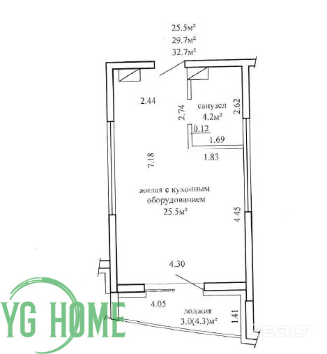 Общая площадь по СНБ 32,7м2/общая 29,7м2/жилая 25,5м2