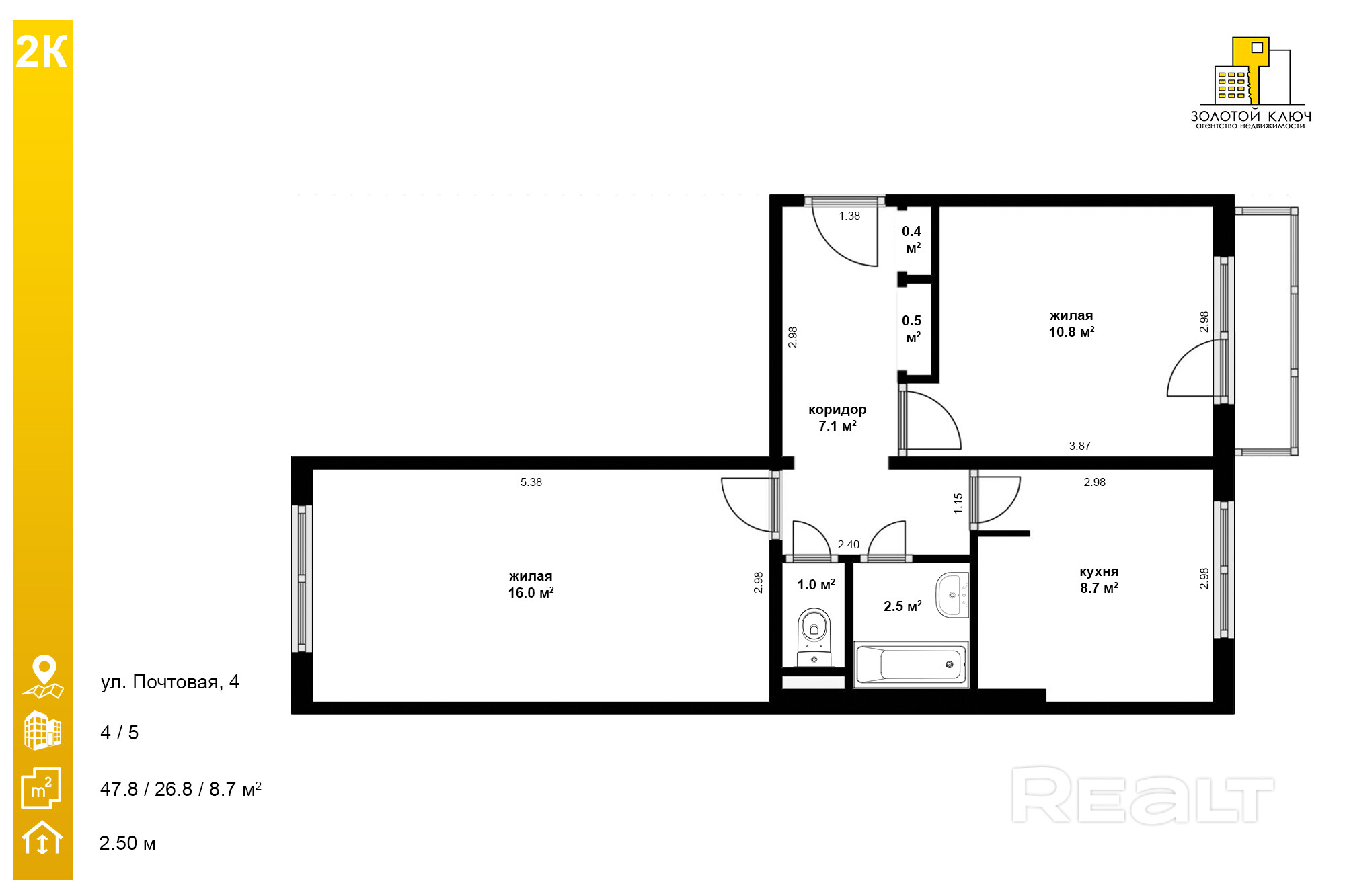 Площадь общая – 47.8 м2 по СНБ, жилая – 26.8 м2. этаж - 4 из 5