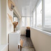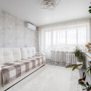 - Жилая комната просторная и светлая, с ламинатом на полу и натяжным потолком. Из комнаты открывается выход на просторный застекленный балкон — идеальное место для отдыха и размещения растений. Практически вся мебель и кондиционер остаются.