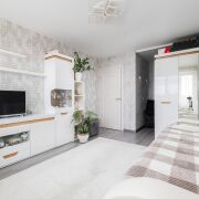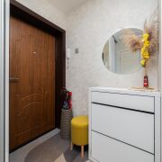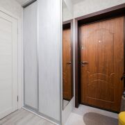 - Коридор встречает вас металлической входной дверью и встроенным шкафом-купе для хранения. Пол из плитки, потолок натяжной. Мебель в коридоре остается также будущим владельцам.