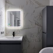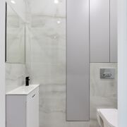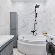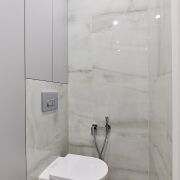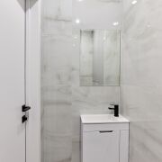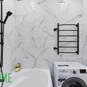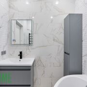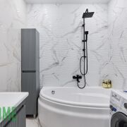 - Сан узел облицован плиткой и оборудован современной сантехникой и мебелью для хранения.