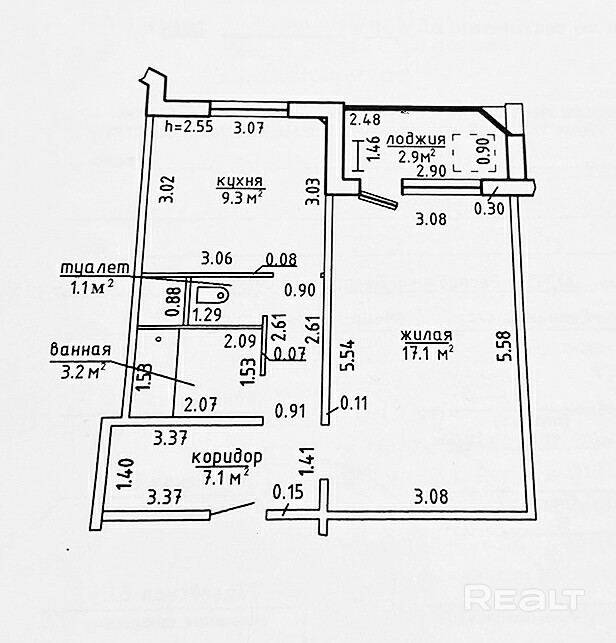 Общая площадь: 40.7 кв.м. (комната 17.1 + кухня 9.3 + прихожая).