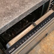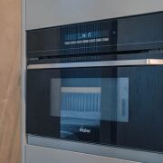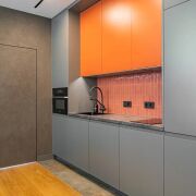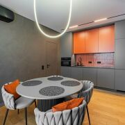 Объединение гостиной и кухни в единое пространство – это не только модный тренд, но и залог непринужденного общения и ощущения простора. Здесь этот прием реализован с особым вкусом. Кухня оснащена самой современной техникой: встроенный духовой шкаф, микроволновая печь и посудомоечная машина обеспечивают максимальное удобство. Обеденная зона украшена столом ручной работы, созданным по индивидуальному заказу, и дополнена эффектной люстрой. Ее мягкий, приглушенный свет создает интимную атмосферу, идеальную для уютных ужинов и душевных бесед. Текстура и оттенок стола тщательно подобраны, чтобы гармонировать с общим стилем интерьера.