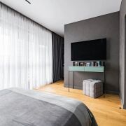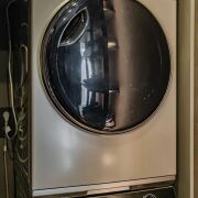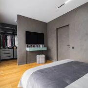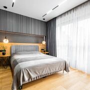 Спальня – это ваш личный оазис тишины, выполненный в лаконичном стиле и поддерживающий общую цветовую гамму. Мягкий текстиль – легкие шторы, уютные пледы и декоративные подушки – добавляют пространству тепла и завершенности. Особое удобство представляет собой зона гардероба, интегрированная в спальню, где размещены стиральная и сушильная машины. Это практичное решение освобождает место в ванной или на кухне, делая вашу квартиру еще более функциональной.