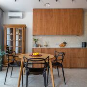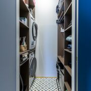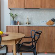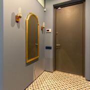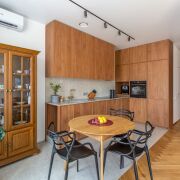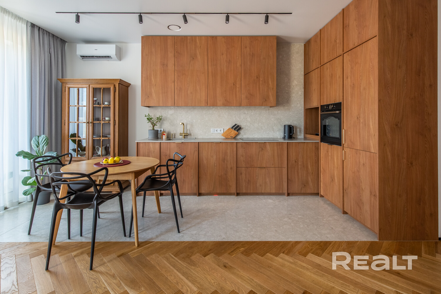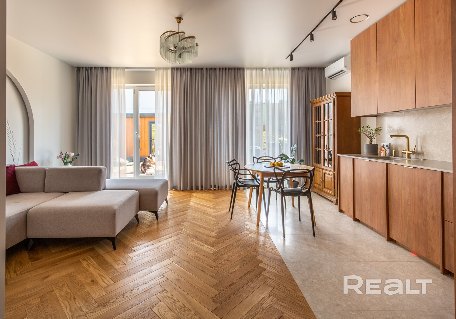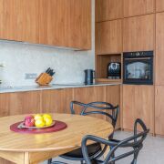 Винтажные итальянские бра и зеркало у входа. Консоль из массива дуба. Большой встроенный шкаф с подсветкой и зонами для взрослых и детей, а также антресолью. Постирочная выполнена из газосиликатных блоков и оборудована окошками. Здесь установлены стиральная и сушильная машины, а также встроенная компактная гладильная доска. Светлая и уютная кухня-гостиная оборудована навесной и встроенной мебелью с бытовой техникой: варочная панель, духовой шкаф, посудомоечная машина, холодильник. В умывальник встроен измельчитель пищевых отходов. Из гостиной есть выход на террасу.