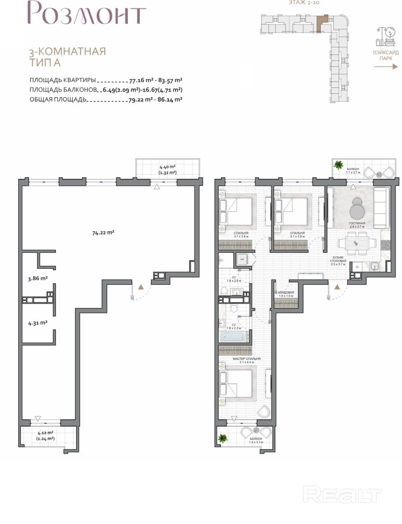 Большая квартира с окнами на улицу и двор, и с лоджией и с балконом. Вид на парк, вид на выставочный центр и поле. Срок сдачи февраль 2026. бОльшая часть работ уже сделана.
