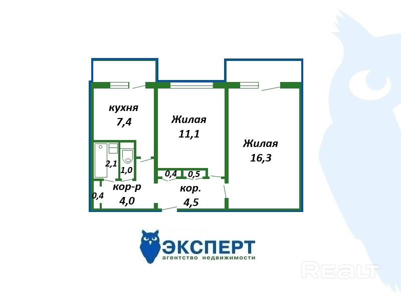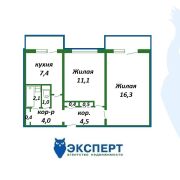 Площадь квартиры - 47,5 кв.м.: две жилые комнаты 16,3 кв.м.