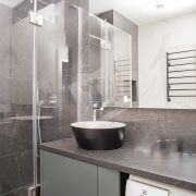 — Подсветка рабочей зоны, на полу ламинат, санузел в плитке.