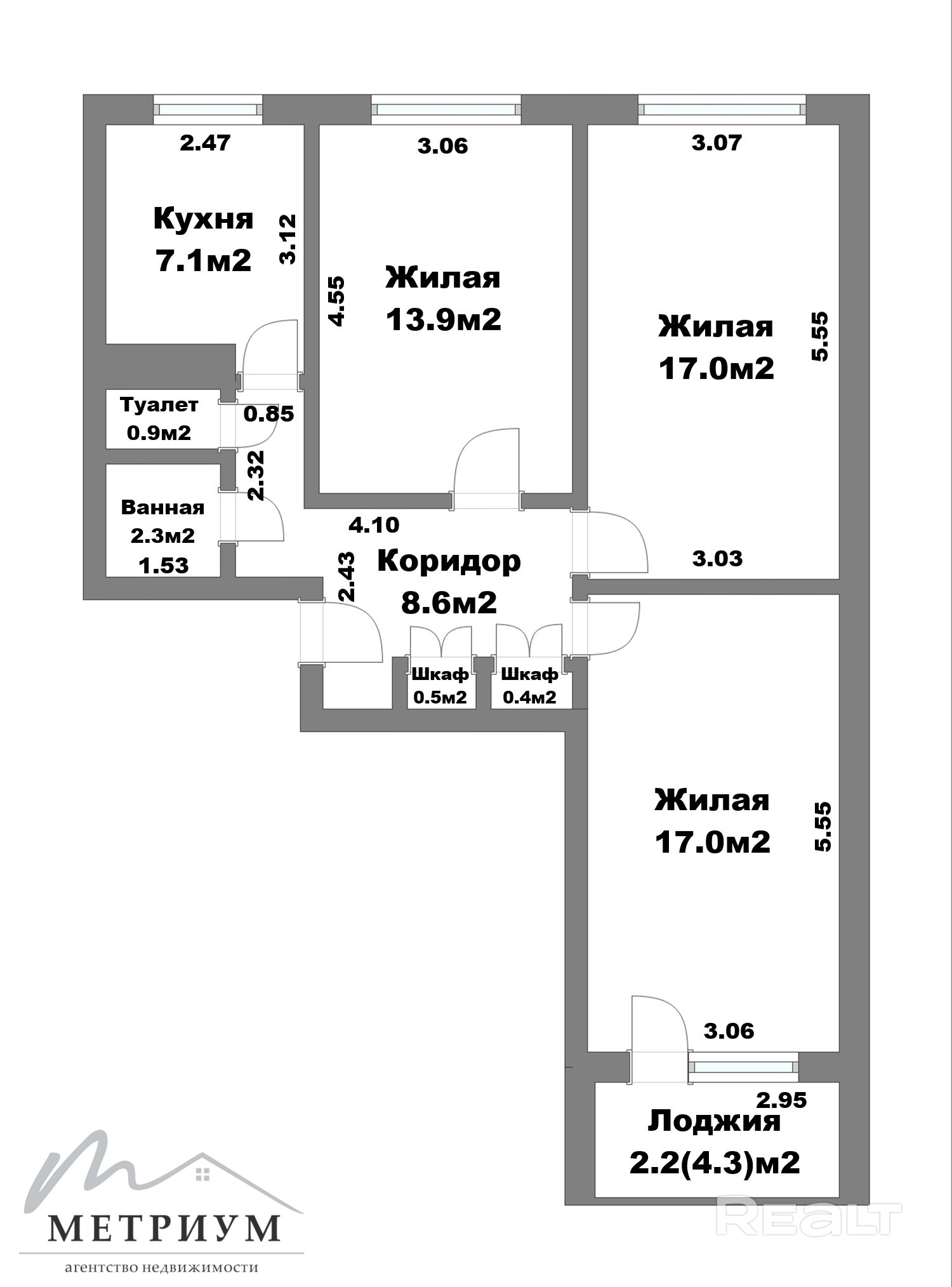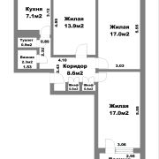 Спальня почти 14 кв.м. и два больших комнаты по 17 кв.м., одна из которых с выходом на лоджию.