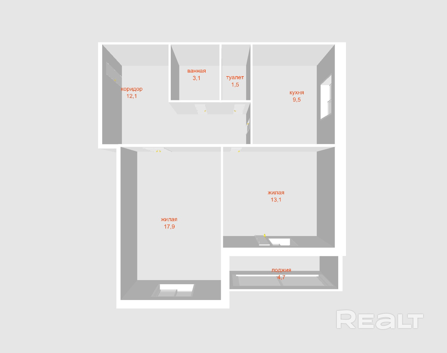 Квартира расположена на 1-ом высоком этаже 19-этажного дома. Современная, рациональная планировка: кухня – 9,5 м.кв., комнаты – 17,9 и 13,1 м.кв., коридор – 12.1 м.кв.