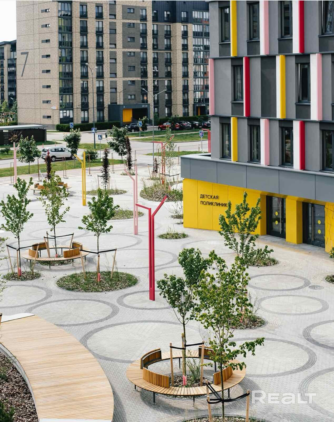- Закрытый и уютный двор: территория полностью свободна от машин, что создаёт безопасное пространство для детей и взрослых. Для уединения и зонирования во дворе созданы декоративные холмы.