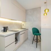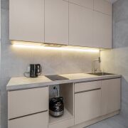 Столешница, рабочая кухонная зона, пол в с/узле и прихожей- керамогранит.