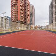 Территория вокруг дома ухожена и обустроена современными площадками для детей и спорта (теннисный корт, волейбольная площадка).