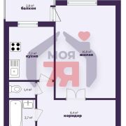 - Общая площадь составляет 39,3 кв. м., жилая 16,8 кв. м., кухня 7,2 кв. м.