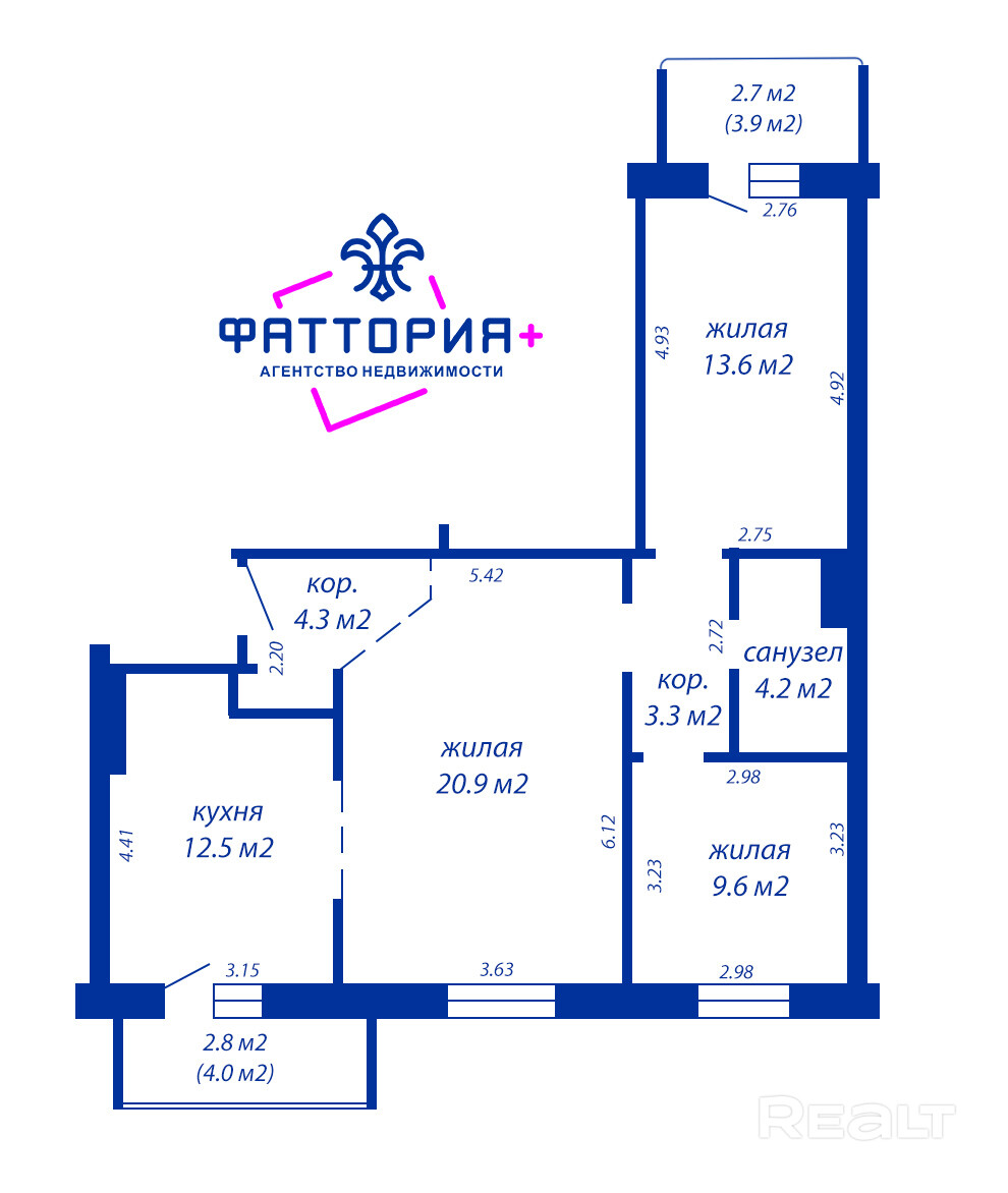 СНБ -73,9 м2 / общая - 68,4 м2 / жилая - 44,1 м2 / кухня - 12,5 м2