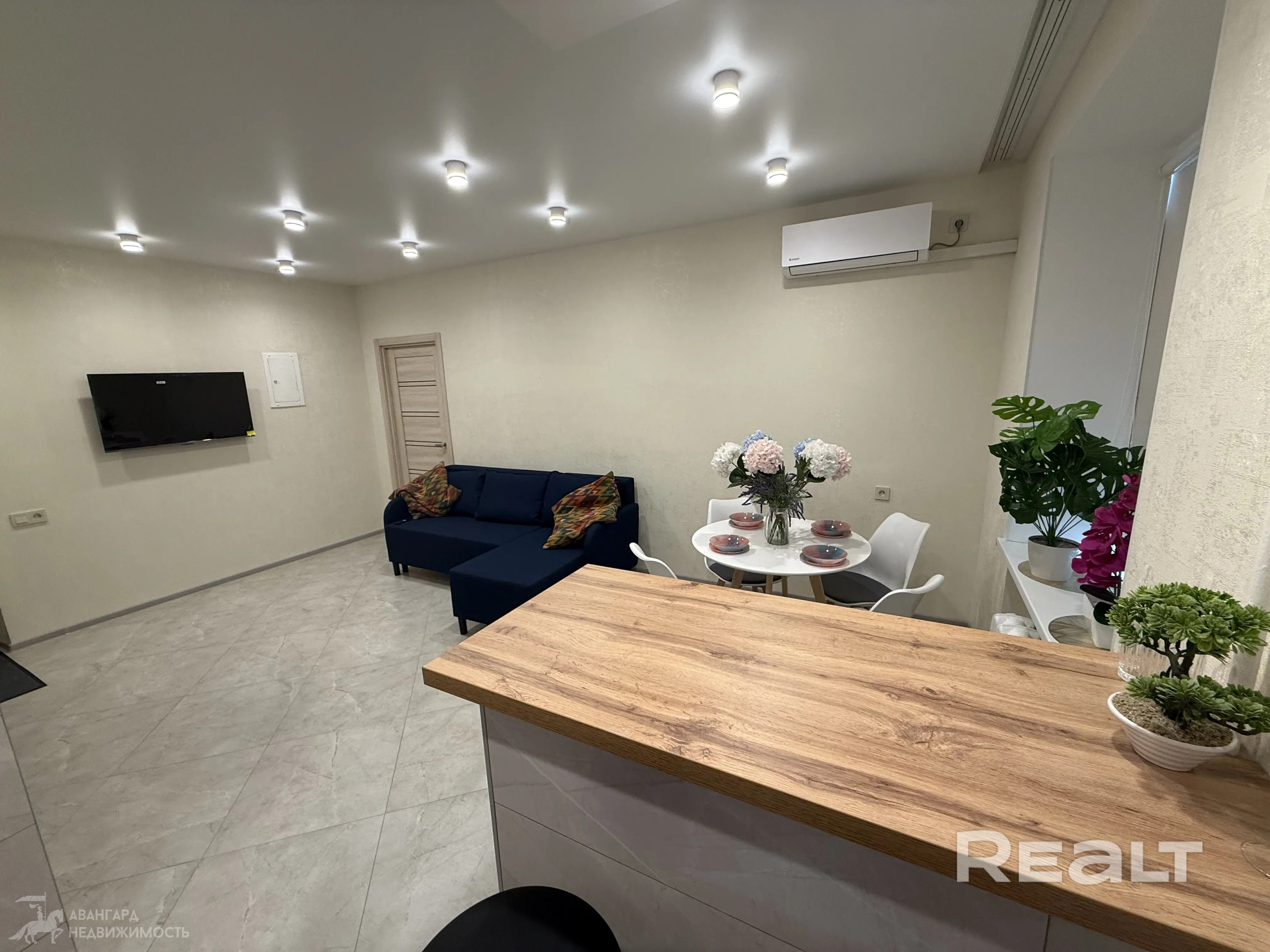 В квартире выполнен качественный ремонт: подвесные потолки, стеклопакеты, встроенная мебель, качественный ламинат, кондиционер.