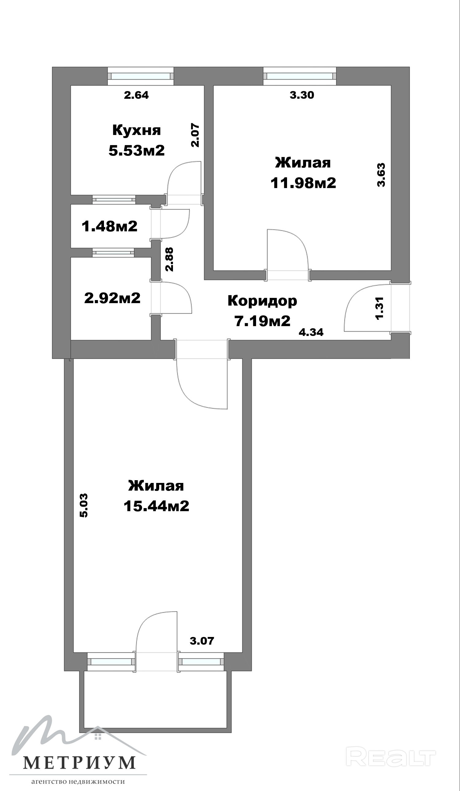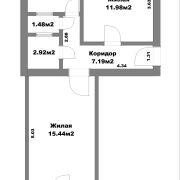 - удачная и функциональная планировка: квартира общей площадью – 44,5 м кв., жилой площадью – 27,4 м кв. включает две просторные изолированные комнаты 15,44 м кв., 11,98 м кв., кухню 5,53 кв. м, коридор 7,19 м кв., раздельный санузел и балкон; кухня при желании может быть объединена с соседней комнатой;