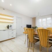 - Кухня-гостиная является функциональным центром квартиры. На полу керамогранит, кухня с фасадами из массива дуба. Вся встроенная техника остаётся, включая духовой шкаф Bosch, индукционную варочную панель, посудомоечную машину Bosch, холодильник и микроволновую печь Samsung. Установлен трёхступенчатый фильтр питьевой воды. Обеденный стол выполнен из массива ясеня. В гостиной остаются диван, телевизор и автоматические шторы. Окна выходят во двор, а приточно-вытяжная вентиляция обеспечивает тишину и комфорт.