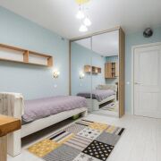 - Все спальни оборудованы приточной вентиляцией, что обеспечивает свежий воздух без открытых окон, шума и пыли. В первой спальне остаётся вся мебель, рабочий стол, шкаф-купе и автоматические шторы. Управление электрикой осуществляется через систему «умный дом». Есть выход на лоджию.