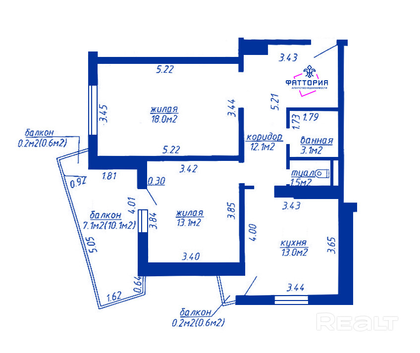Квартира имеет уникальную планировку, наличие 3 балконов и грамотное зонирование пространства: большая кухня (13 м2) и две просторные комнаты (18 м2 + 13,1 м2), делает данную недвижимость - вне конкуренции!