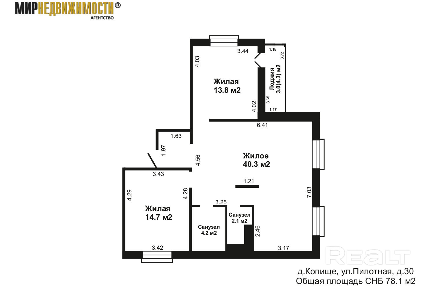 Общая площадь по СНБ 78,1 м2, общая площадь 75,1 м2, жилая площадь 45.0 м2.