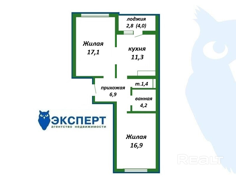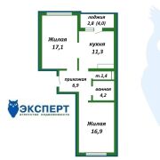 2 большие раздельные комнаты (17,1 кв.м и 16,9 кв.м.), кухня 11,3 кв.м.,