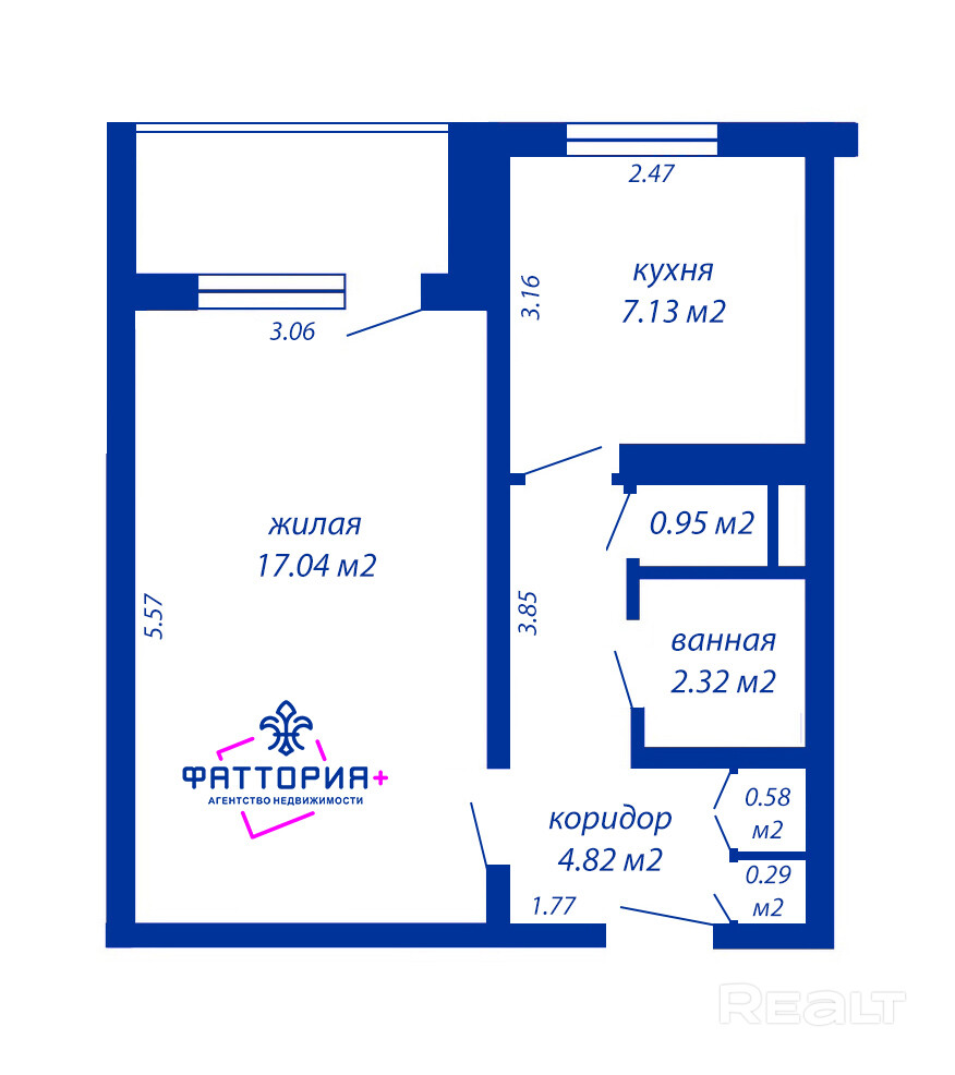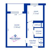 Планировка: комната 17,4 м2 с выходом на большую застеклённую лоджию, кухня 7,2 м2, раздельный санузел и удобный шкаф в коридоре.