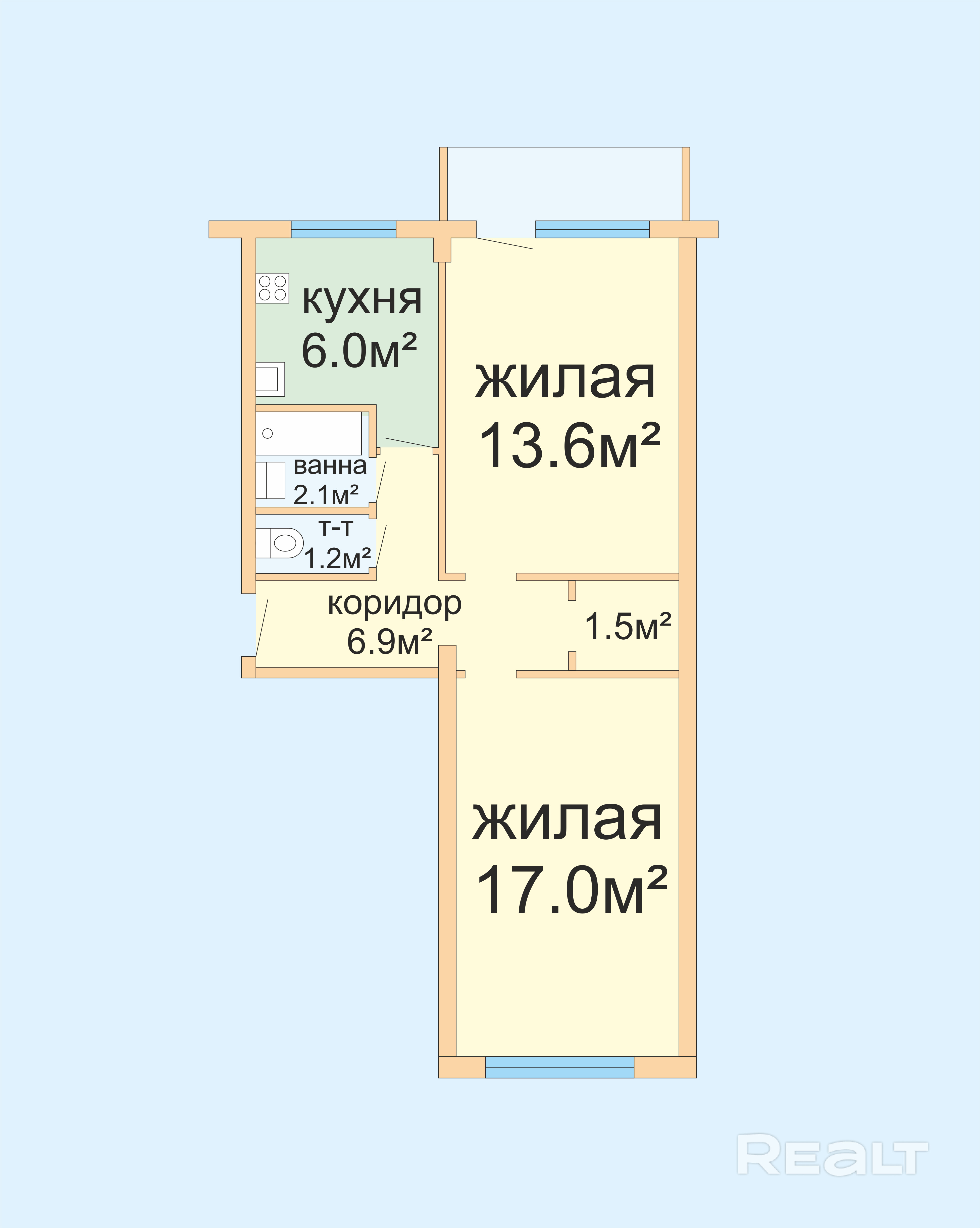 Жилье возвели в 1968 году. Площадь двушки - 48,3 м2. На кухню приходится 6 квадратных метров.