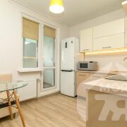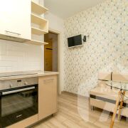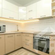 -Кухня площадью 9,3 м2 — просторная, что редко встречается в 1‑комнатных квартирах. Установлен современный кухонный гарнитур со встроеной посудамойкой, вытяжкой, духовым шкафом, а также варочной панелью. Есть место для обеденной зоны — можно завтракать, обедать, принимать гостей. Из кухни прямой выход на лоджию — удобство при готовке, возможность расширить пространство летом.