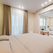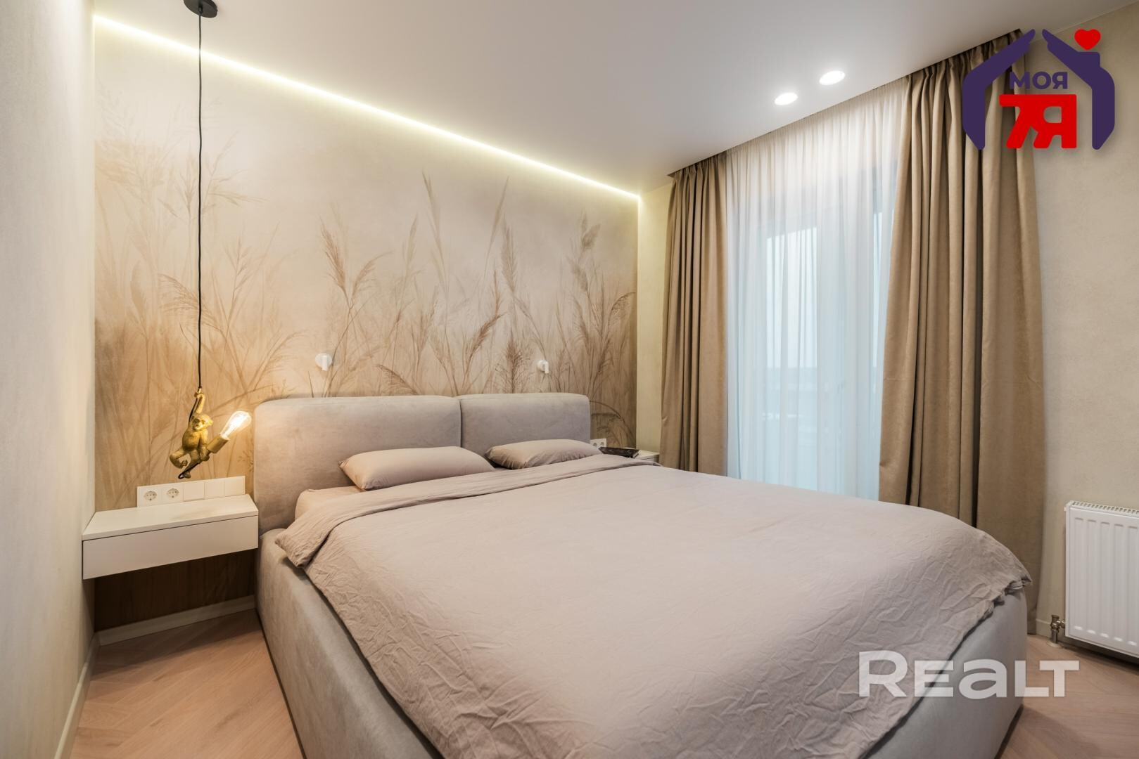 - Квартира выполнена по авторскому дизайн-проекту архитектора из Москвы, а художественное оформление создавалось декоратором с уникальной техникой. В спальне — ручная роспись стены, выполненная топ-художником Беларуси, а по всей квартире стены имеют художественную накатку в 3 слоя, что обеспечивает не только эффектный внешний вид, но и долговечность отделки. Пространство продумано до сантиметра: много скрытых систем хранения, при этом интерьер остаётся визуально лёгким и аккуратным, без лишнего шума.