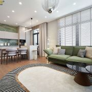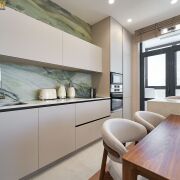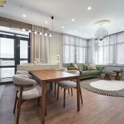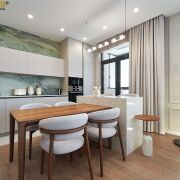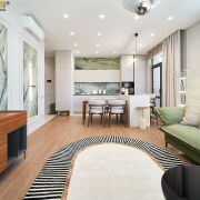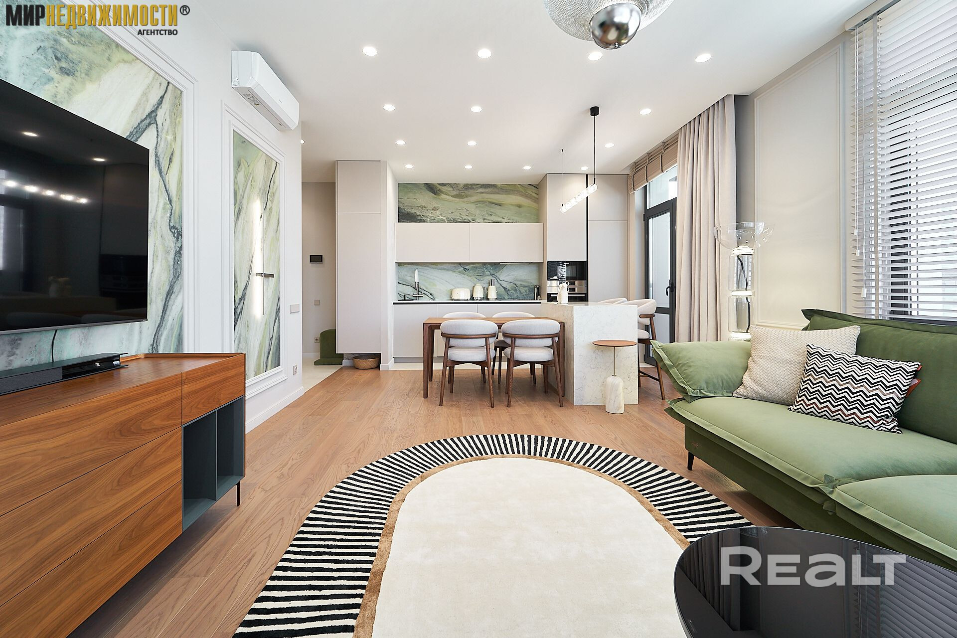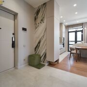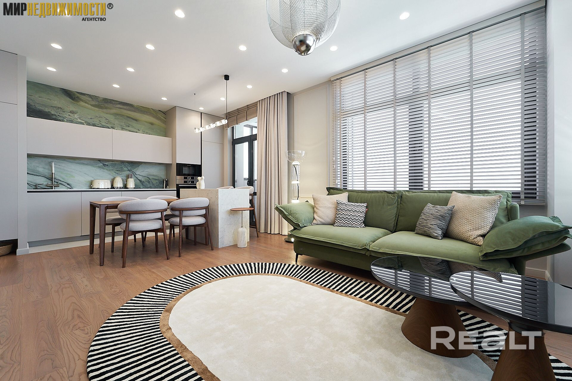 Квартира в состоянии «Move-inReady», готовность к немедленному заселению. Выполнен ремонт с «характером», вместо стандартной белой коробки – на стенах слэб камня со сложным цветом, натуральные материалы с благородной фактурой и яркие акценты в декоре и освещении.