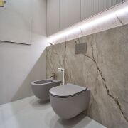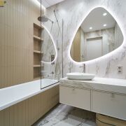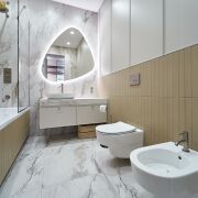 Отделка премиум-класса: плитка и керамика – Италия, сантехника – Jacob Delafon, на полу паркетная доска - Coswick.