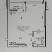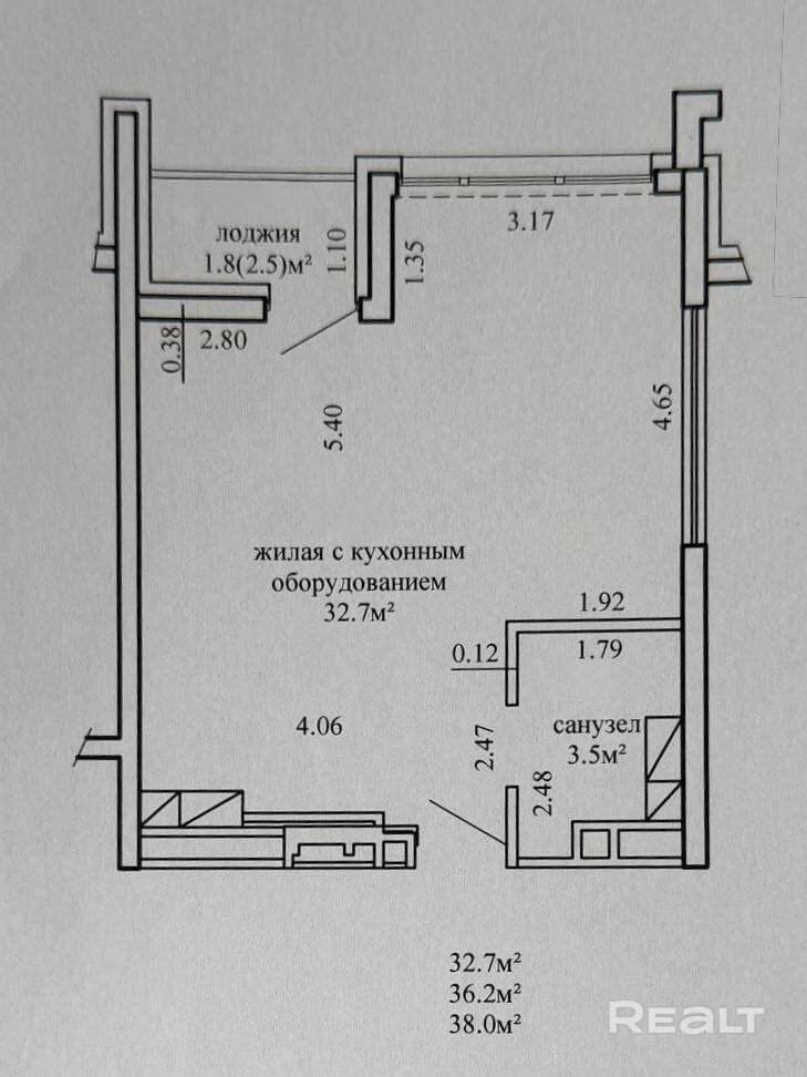 - площадь: по СНБ — 38 м2, общая — 36.2 м2, жилая — 32.7 м2;