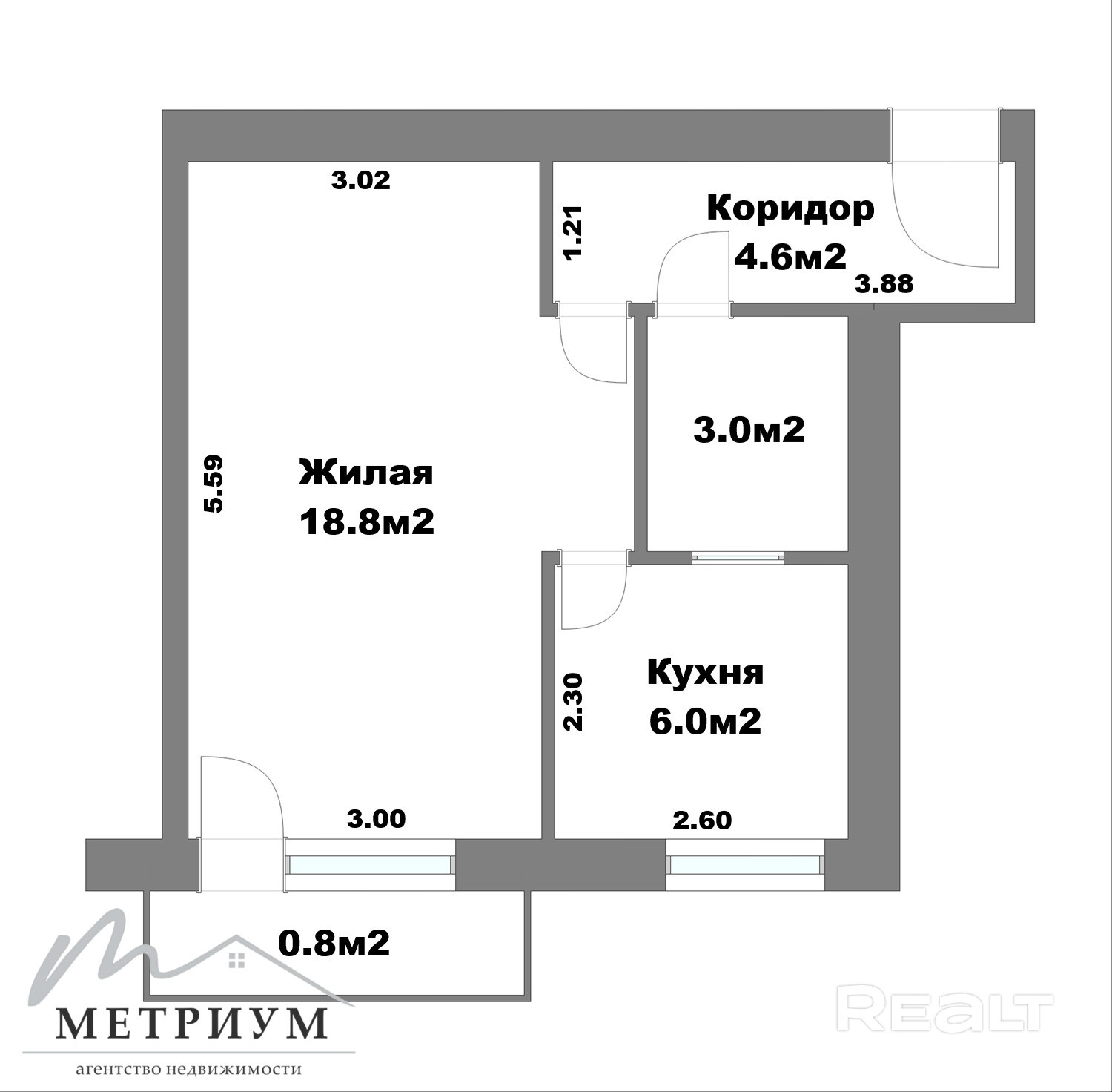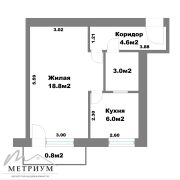Общая площадь: 33,2 м2 — достаточно пространства для комфортного проживания. • Жилая площадь: 18,8 м2 — уютная изолированная комната, где можно расслабиться после долгого дня. • Кухня: 6,0 м2 — просторная кухня, где можно не только готовить, но и проводить время с близкими.