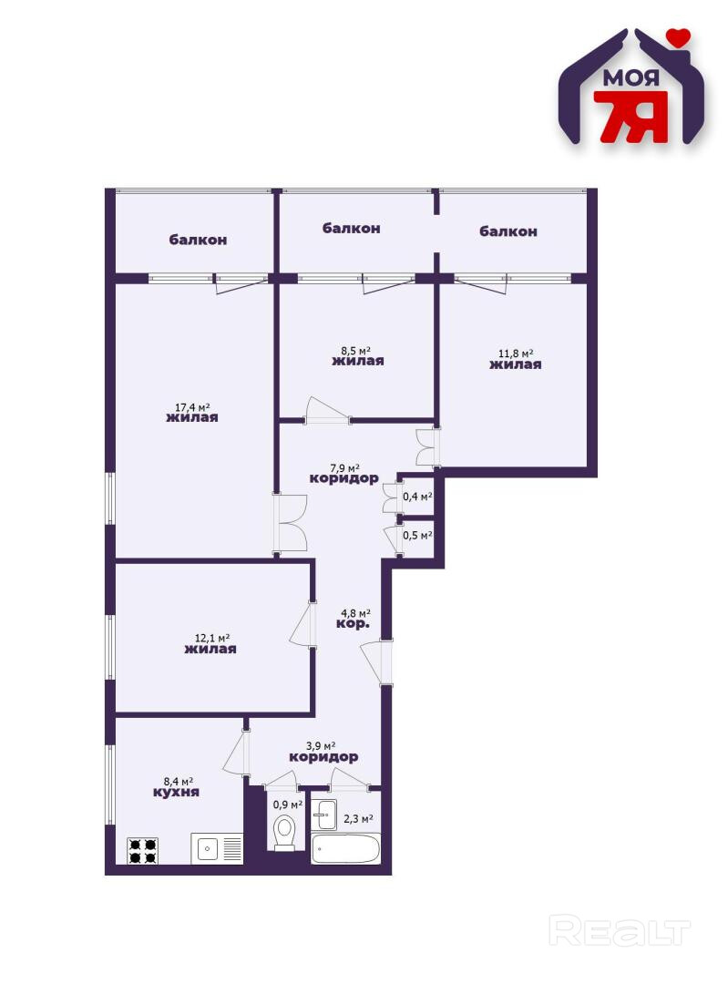 4‑комнатная квартира 82,8 кв.м. с тремя балконами