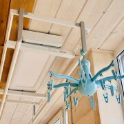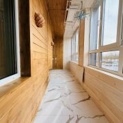 Просторный утепленный балкон с видом на Свислочь оборудован, как полноценная комната отдыха. Утеплен каменной ватой, стеклопакеты заменены на энергоэффективные двухкамерные. Отделка выполнена в скандинавском стиле натуральным деревом (имитация бруса). Установлена потолочная автоматическая сушка Xiaomi.